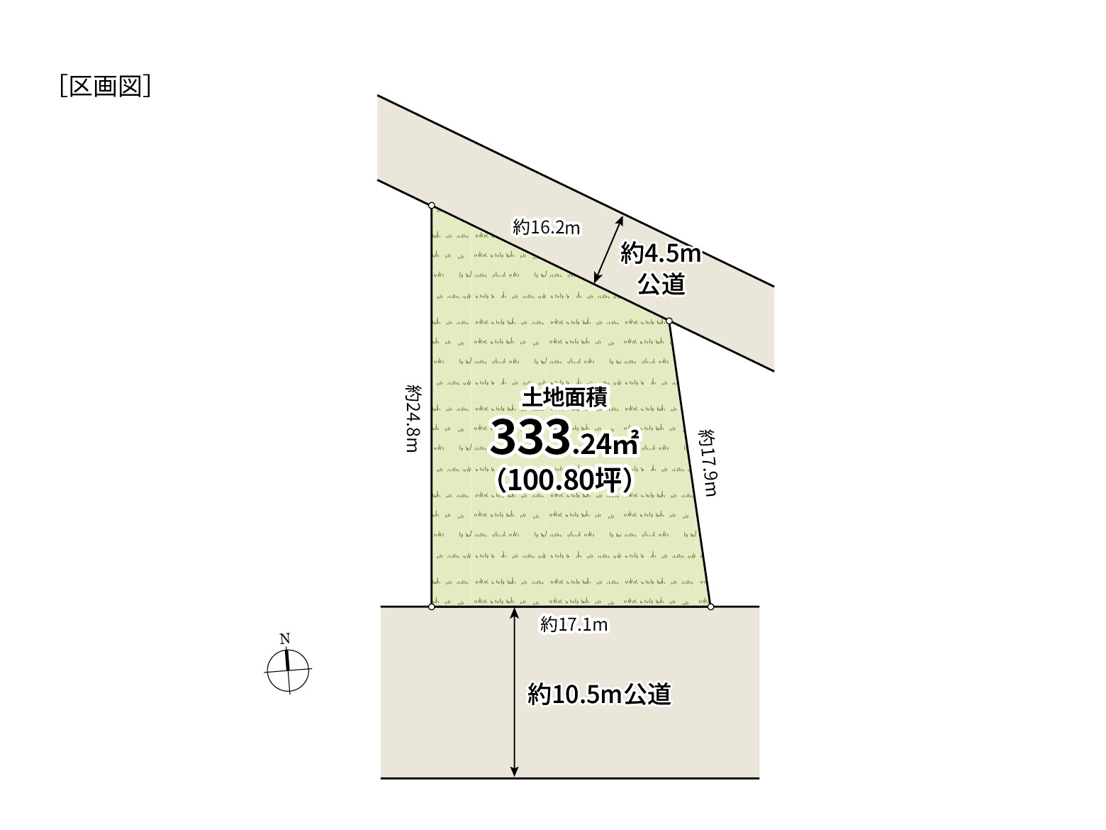 土地面積 | 333.24㎡ / 100.80坪 | 接道状況 | 北側約4.5m公道、南側約10.5m公道 |