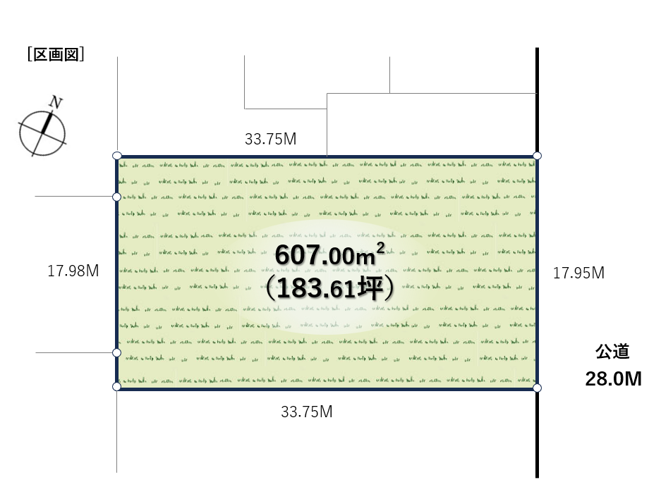 | 土地面積 | 607.00㎡ / 183.61坪 | 接道状況 | 東側公道 幅員約28m、北側私道 幅員約4.0m |